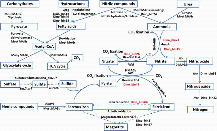 本研究从宏基因数据组装出46个高质量的基因组,分别代表6个细菌门及1个古菌门。基因组的分析和比较结果指出这些基因组大部分都显示是新的纲、目、科、属或种且未曾成功被分离为纯培养。相比包裹骨骼的泥岩样品,骨骼富集了Nitriliruptoria, Deltaproteobacteria and Betaproteobacteria几个纲里的基因组。对基因组功能基因的诠释,揭示了多个物种可能参与碳、氮、硫和铁的代谢。蛋白组学分析发现很多微生物基因已表达,相反,没有发现内源性恐龙胶原蛋白肽。研究表明:出土的恐龙骨骼是微生物(包括新谱系)的栖息地;与外部沉积物相比,骨骼化石内部独特的微生境和地球化学组分支持了较高的微生物生物量,也包含多组基因相互联系的生物地球化学过程;这些微生物群落在中生代恐龙化石中的存在敦促科学家们在寻找残存的内源性生物分子时,必须格外审慎。
