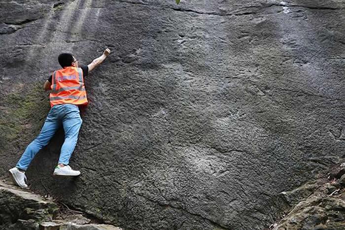 (化石网报道)据澎湃新闻(吕新文):2019年3月,攀岩爱好者在重庆歌乐山国家森林公园东部沙人防空洞由发现的一堆“鸡爪印”,后经重庆市规划和自然资源局组织古生物学专家团队初步鉴定为诞生于一亿九千万年前下侏罗统珍珠冲组兽脚类恐龙足迹群。