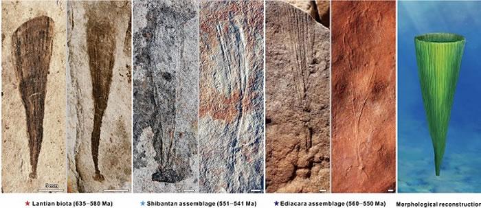 扇状化石Flabellophyton是蓝田生物群(635-579Ma)中的代表分子,以碳质压膜的形式的保存于埃迪卡拉纪蓝田组二段的黑色页岩中;随后又被发现于澳大利亚南部埃迪卡拉纪中-晚期的埃迪卡拉生物群(560-550Ma)中,并以铸模或铸型的方式保存在埃迪卡拉砂岩段;近来,该研究团队又在华南埃迪卡拉纪晚期的石板滩生物群(551-539Ma)中发现了这类化石,其以铸模或铸型的方式保存在灯影组石板滩灰岩段中。基于我国华南蓝田生物群和石板滩生物群中的化石材料,研究人员对这类化石进行了系统分类和描述,识别出了三个不同的形态种:蓝田扇形藻(F. lantianense)、标准扇形藻(F. typicum sp. nov.)和钝锥扇形藻(F. obesum sp. nov)。依据形态学特征和解剖学结构,将其恢复为一种具有基部固着器、下部柄状结构、上部锥状主体和顶端开口的,营固着底栖、直立生长的疑难生物类型。