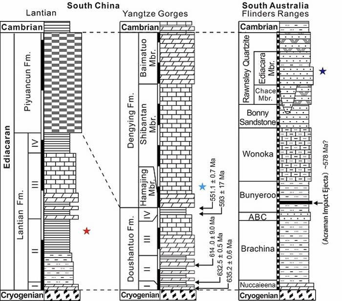 华南埃迪卡拉纪早期蓝田生物群(635-580 Ma)、埃迪卡拉纪晚期石板滩生物群(551-539 Ma)和澳大利亚埃迪卡拉生物群(560-550 Ma)的地层时代