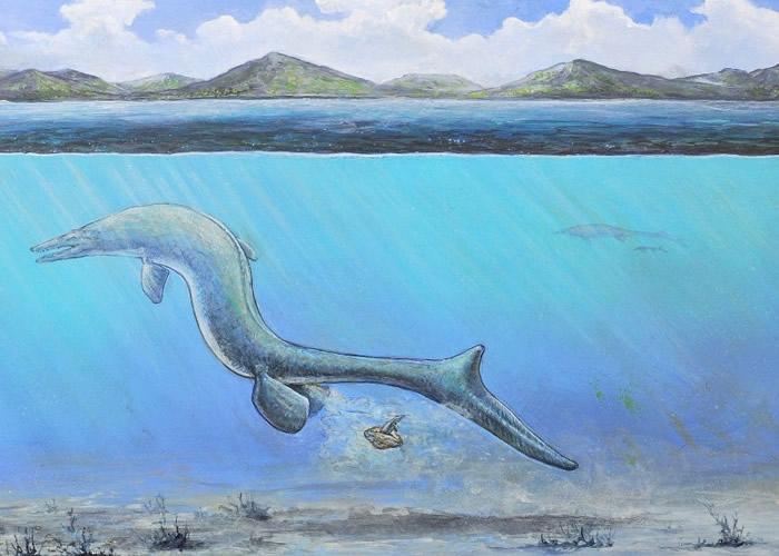 研究人员指化石应是一种已绝种的巨型海洋爬虫类产下的蛋。图为画家构想图。