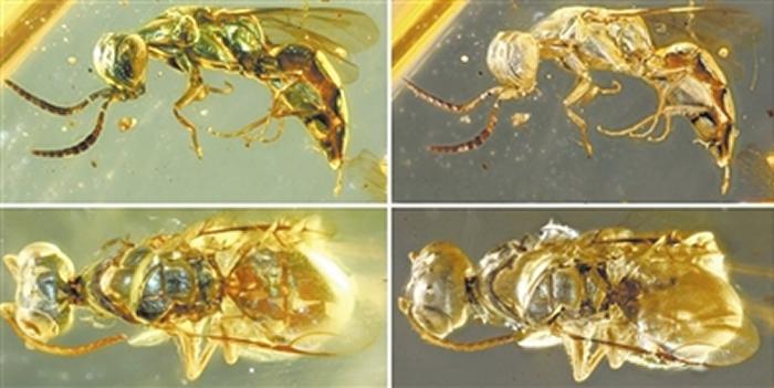 在显微镜下,研究团队发现,这35块琥珀化石的昆虫,包括膜翅目、鞘翅目和双翅目,至少有7个科,其中绝大部分标本属于膜翅目青蜂科,少部分属于鞘翅目隐翅虫科、蜡斑甲科,以及双翅目的水虻科。