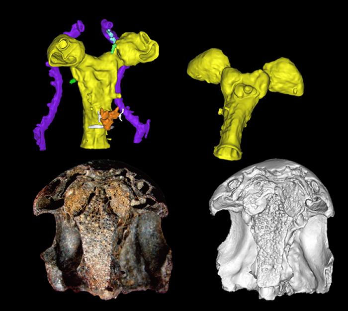 奇异东生鱼(Tungsenia paradoxa)内颅照片与内颅、脑腔三维复原图