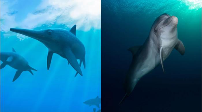 海豚和鱼龙拥有共同特征,或者至少体型结构存在相似性,这是非常惊人的实例,进化偶然发现了两种完全不同的动物——哺乳动物和爬行动物,它们存在相同的进化机制,包括:活产、温血,甚至还有类似的伪装技能。