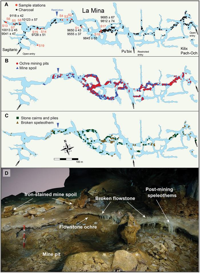 2018年,加拿大麦克马斯特大学地质考古学家Eduard Reinhardt和潜水者来到此地。他们一起确定了数十个矿坑和矿沟,并将其作为采矿活动的证据。他们将该遗址命名为La Mina,西班牙语中意指“矿山”。放射性碳测年显示,最早的矿床是1.2万年前留下的,最年轻的矿床是1万年前留下的。通过在扫描电子显微镜下观察木炭的微小碎片,研究人员认为,这些烟尘来自当地树脂含量高的树木,它们很适合做火把。