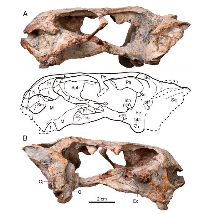 “这块化石十分珍贵,是一个新的物种。”刘俊介绍,这一新类群有下列特征区别于其他属种:犁骨腹面光滑,缺乏翼骨龙骨突,翼骨中板窄,泪骨与隔颌骨接触,翼骨不与上颌骨接触,枕髁宽、弧形,侧齿骨架细、但有明显的背腹面。