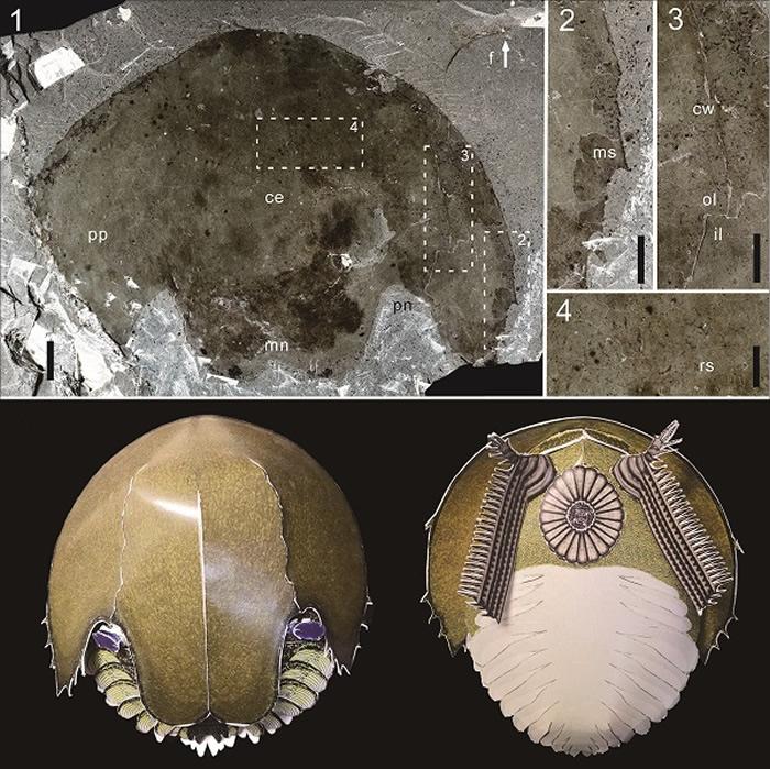 来自华北寒武纪中期馒头组顶部的寒武耙虾Cambroraster标本和复原模型背视和腹视效果