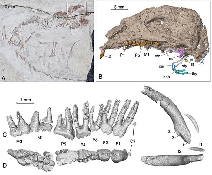 哺乳动物中耳的演化,是一个从达尔文时代就在广泛探讨的问题,也是脊椎动物渐进演化的经典案例。爬行类具原始颌关节(primary jaw joint),由下颌关节骨与头骨上的方骨构成,中耳只有一块听骨(镫骨=耳柱骨)。与此相比,哺乳动物中耳则由锤骨、砧骨、镫骨形成听骨链,外鼓骨支撑鼓膜收集声音,下颌由一块齿骨构成,形成齿骨-鳞骨颌关节。解剖学、发育生物学、遗传学的大量研究证明,哺乳动物的听骨和爬行动物的齿骨后骨和方骨具有同源关系。古生物学也早已提出中耳渐进演化假说,即从爬行类向哺乳动物的典型哺乳动物中耳的演化过程中,齿骨后骨逐步缩小,并与齿骨分离,最终移入颅基部,成为专司听觉功能的结构。但纤细的听骨很难保存为化石,近两百年来发现的中生代哺乳动物中耳化石极少,其形态细节和关节方式一直不清楚,对其演化过程和机制的解释存在极大的人为性,各种推论、假说存在较大争议。