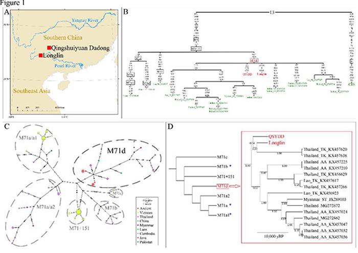 清水苑大洞及广西隆林人线粒体遗传信息分析。(a).清水苑大洞及广西隆林样本地理位置分布 (b).线粒体全基因组突变位点分析 (c).系统发育网络(Network)分析 (d).贝叶斯系统发育树(白帆 供图)