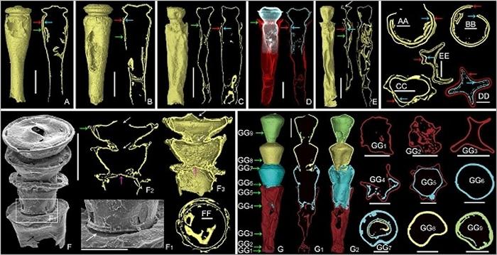 该研究采用近红外显微成像、显微CT、双束电子扫描和场发射电子成像等多项技术手段,发现长久以来被认为是畸变的特异标本实则是记录几丁虫生殖瞬间的关键材料。这类特异标本的一大共性是在一个标本的反口极方向(俗称 底部)发育一个与该标本具有相同形态特征的、个体略小的不完整标本。通过对20枚特异标本的深入研究,识别出几丁虫的两种生殖模式:一个母体一次繁殖一个后代(Fig. 1 A–E)或一次繁殖多个后代(Fig. 1 F–G)。