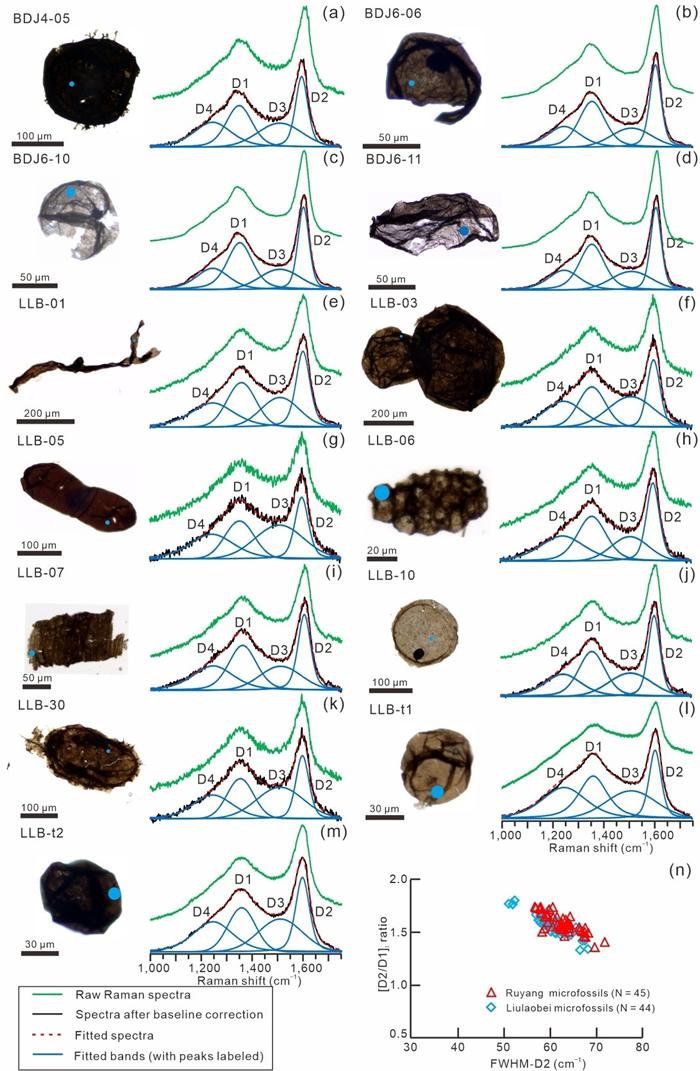 近期,中国科学院南京地质古生物研究所早期生命研究团队的庞科副研究员、硕士研究生吴承羲、李光金博士、万斌副研究员、袁训来研究员等人与美国弗吉尼亚理工大学的唐卿博士、肖书海教授、Robert J. Bodnar教授,以及山东科技大学陈雷教授合作,利用拉曼光谱对华北地台古元古代晚期汝阳群和新元古代早期刘老碑组中产自同一层位的有机质壁微体化石,进行了系统的对比研究。这两处地层中的微体化石,均只经历了低级别的变质作用,并利用拉曼地质温度计得出两处最高变质温度均在200℃左右。相关成果已于近期发表在地学类学术期刊《前寒武纪研究》(Precambrian Research)上。