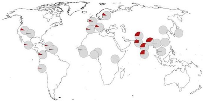 这些基因变异在非洲几乎完全不存在,在孟加拉国出现的频率最高。