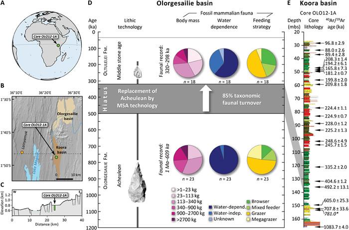 (化石网整理)据中国科学报(辛雨):几十万年生存的关键工具——石制手斧——在70万年里几乎没有什么变化。研究人员一直在争论长时间停滞背后的原因。10月21日,《科学进展》发表的一项对肯尼亚古湖床异常环境数据的研究表明,大约40万年前,在气候变化、地貌演变和动物种群快速变化的综合影响下,新的社会技术形成了,包括更小的黑曜石刀片和远距离贸易网络。