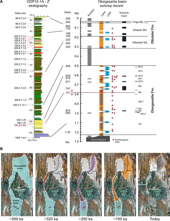 2012年,在肯尼亚一家钻井公司的帮助下,Potts团队从附近盆地的一个古湖床底部提取了沉积物。通过观察沉积物的微观特征,研究人员得出了该地区气候和生态的粗略时间表。硅藻和藻类的存在让科学家了解了湖水的水位和盐度,例如,叶蜡帮助他们判断周围的环境是木质的还是绿色的。