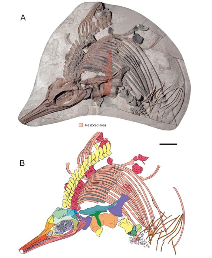 与其他鱼龙相比,这种长约6英尺(1.8米)的爬行动物有极深的肋骨、巨大的眼睛和小而光滑的牙齿。这些特征分别表明,它能在昏暗的光线下看得很清楚,而且它以鱿鱼等小型猎物为食。这样的特征非常适合到黑暗的海洋深处进行长时间的潜水,因为那里有大量的乌贼等动物。