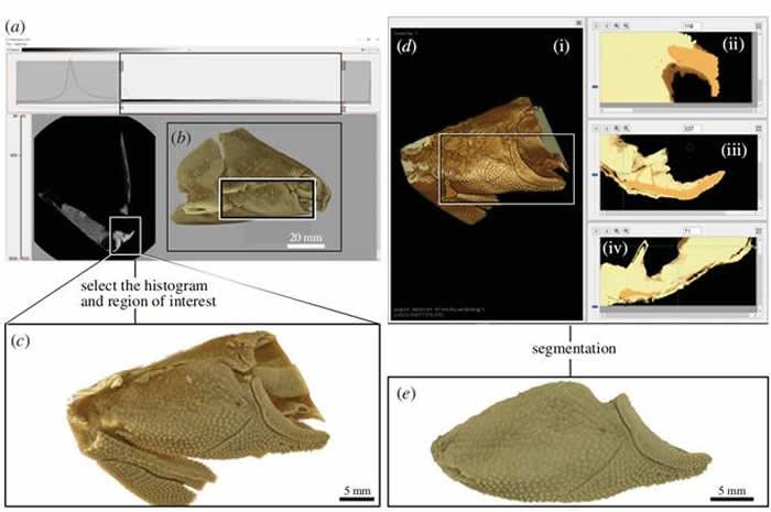 Drishti paint中使用3D Freeform Painter工具对澳大利亚早泥盆世盾皮鱼头部化石执行三维分割