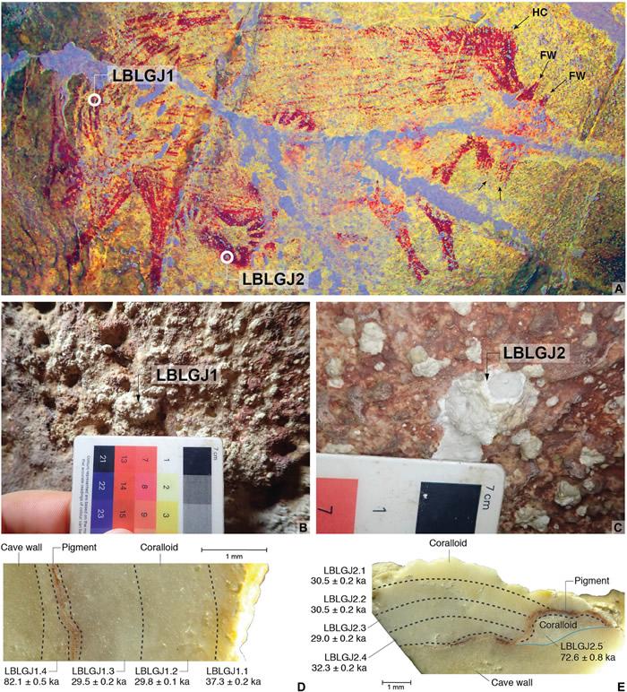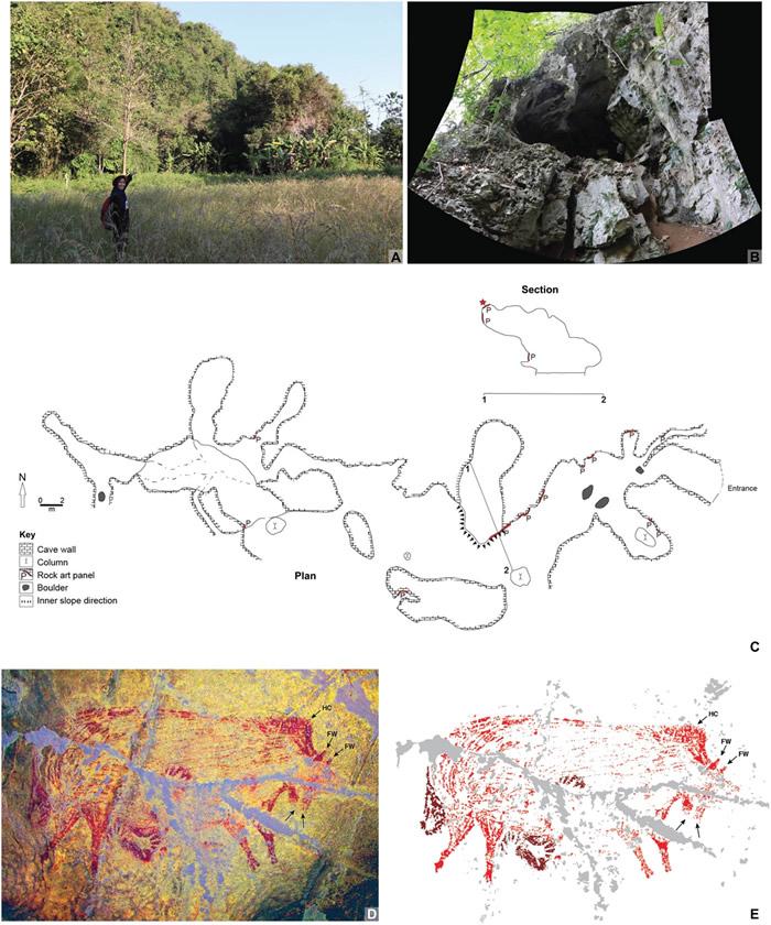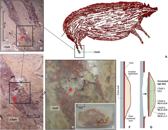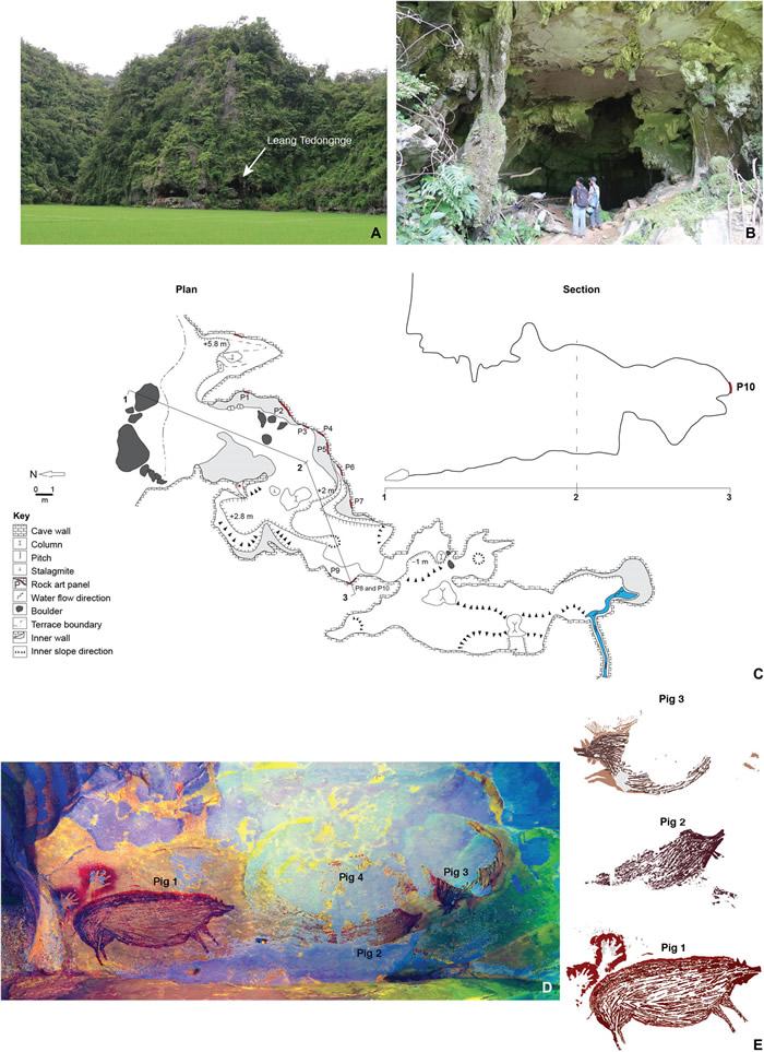 壁画上的3头猪中每一头都长1米多,由红色颜料绘制而成。经鉴定可能是苏拉威西岛疣猪,这种短腿野猪为该地特有,独特的面部疣也是该物种的一大特色。布鲁姆等人发现,从新发现的壁画上收集的矿物至少有45500年的历史。这意味着最早的现代洞穴艺术并非产生于冰河世纪的欧洲,而起源于更早的时代。