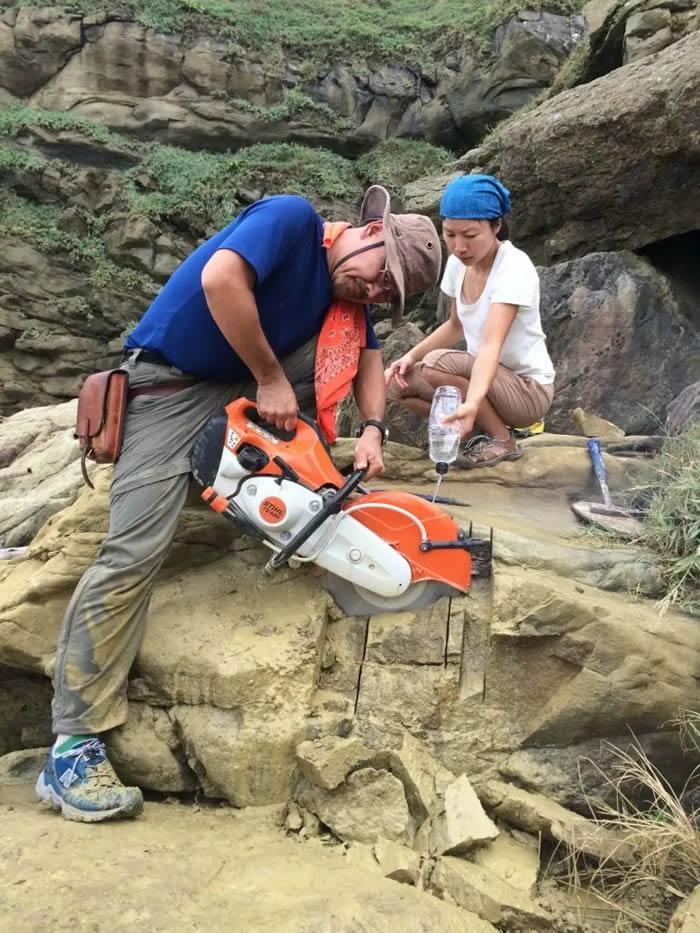 奈良正和博士(日本高知大学)和Sassa Tzu-Tung Chen女士(瑞典哥德堡大学)在台湾八斗子为新的遗迹化石取样。图片来自Ludvig Lo wemark