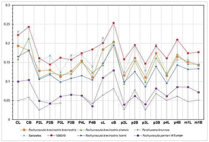 在对比研究各个不同地区或年代的短吻硕鬣狗时,研究人员发现这些鬣狗在大小和形态上确实存在若干差异和不同的(图3和4),尽管比较细微。另一方面,这些鬣狗彼此之间又可能存在着比较密切的联系。譬如,V26310虽说与(狭义)短吻硕鬣狗的模式标本最接近,但又保留了桑氏硕鬣狗的若干形态特征,极大地缩短了(狭义)短吻硕鬣狗与桑氏硕鬣狗之间的形态隔阂。再者,我国陕西蓝田公王岭、德国Untermasfeld和意大利Olivola等地点的短吻硕鬣狗也同样揭示了不同短吻硕鬣狗之间可能存在的系统发育联系。据此,研究人员分析认为欧亚大陆的短吻硕鬣狗应该归为同一物种,但需进一步划分为不同的亚种(群)。这些亚种(群)彼此近乎构成一个具有祖裔演化关系的支系。虽说芬兰著名古生物学家柯登(B. Kurtén)早在上个世纪五十年代,就提出了类似的观点,不过柯登当时主要视这些为不同的地理亚种(群)而已。本项的研究结果对此传统观点提出了挑战,指出这些亚种(群)并不是因地理隔离分化而引起的,它们实际上是短吻硕鬣狗支系在不同演化阶段的表现。
