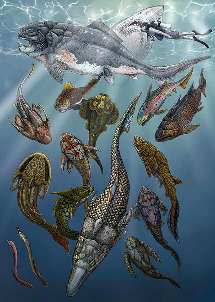 “鸭嘴兽古鱼”Brindabellaspis(前景中央)和其他史前鱼类复原图(杨洪宇、郑秋旸绘)。画面右上方的大白鲨和人类潜水员为现代有颌脊椎动物的代表。
