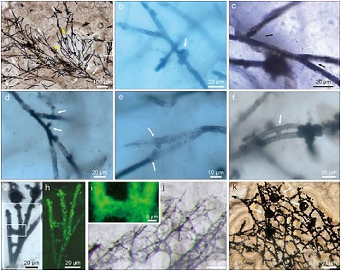 研究发现,微体化石主要由两类结构组成:一种是可多次分叉的丝体;另一种是与丝体相连接的空心球体。其中,丝体按照直径大小的区别,可分为形态类型A(直径在5-9微米之间)和形态类型B(直径在2-3.4微米之间)。丝体长度可超过几百个微米,甚至更长。丝体内部是空心的,没有横向的隔壁。