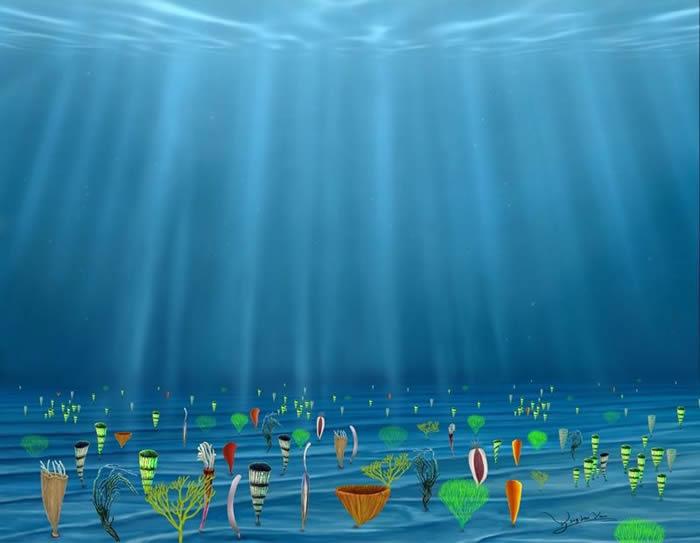 约6亿年前的远古海洋复原图。中科院南京地质古生物研究所供图