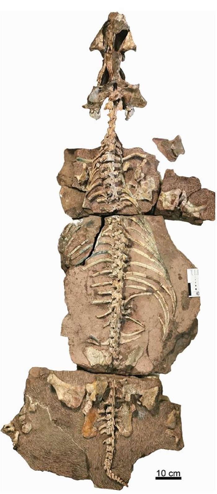 刘俊指出,虽然二齿兽类是当时常见的四足动物,有完整的骨架的属种还是很少,尤其是中到大型的种类。新发现的“九峰吐鲁番兽”正型标本中保存了由50枚脊柱组成的完整脊柱(6枚颈椎、23枚背椎、6枚荐椎、15枚尾椎)。目前看来,二齿兽类脊椎数目介于40-50枚之间,大多数有6枚颈椎、3-7枚荐椎,不超过25枚背椎及15枚尾椎,尾巴都不长。
