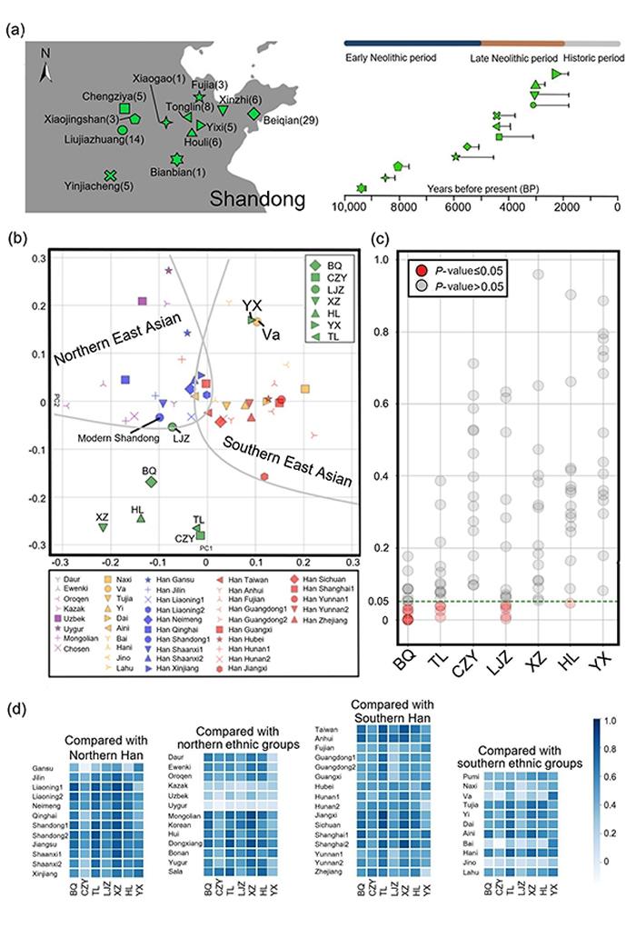 图1.古代山东人群线粒体基因组分析。(a)来自山东省12个考古遗址的古代人类的地理和时间分布;(b)山东古代人类与现代东亚人群的主成分分析图(PCA);(c)古代山东人群与现代东亚人群之间的遗传距离的P值(Φst);(d)古代山东人群与现代东亚人群之间线粒体单倍群频率的相关性热图。