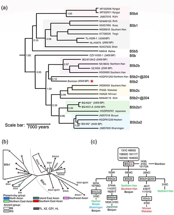 最后,研究团队在距今约9500年前的扁扁洞遗址中发现了目前发现的最古老的B5b2支系个体,并且构建了B5b2支系的系统发育树,计算了B5b2支系下各单倍体型的分歧时间(图2.)。结果表明了在B5b2支系下,距今约9500年前的扁扁洞个体、距今约5500-5300年前左右的北阡遗址个体,可能与该谱系的某些东亚人群和北亚人群的祖先有关,即B5b2这一支系人群很有可能是从山东地区向外部地区进行扩散的。
