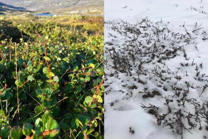 图中是夏天和冬天的矮桦树,冬季它仍能从积雪中钻出来,目前,美国科罗拉多大学博尔德分校最新研究称,大约12.5万年前间冰期,远古时期的北极竟然与现代北美洲最北部地区十分相似,那时的北极并非白色的,而是充满绿色的植物