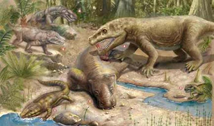二叠纪长着犬牙厉齿的丽齿兽咬杀吞食大型植食兽足类,然而,两者都在二叠纪末大灭绝中灭亡。(郭肖聪)