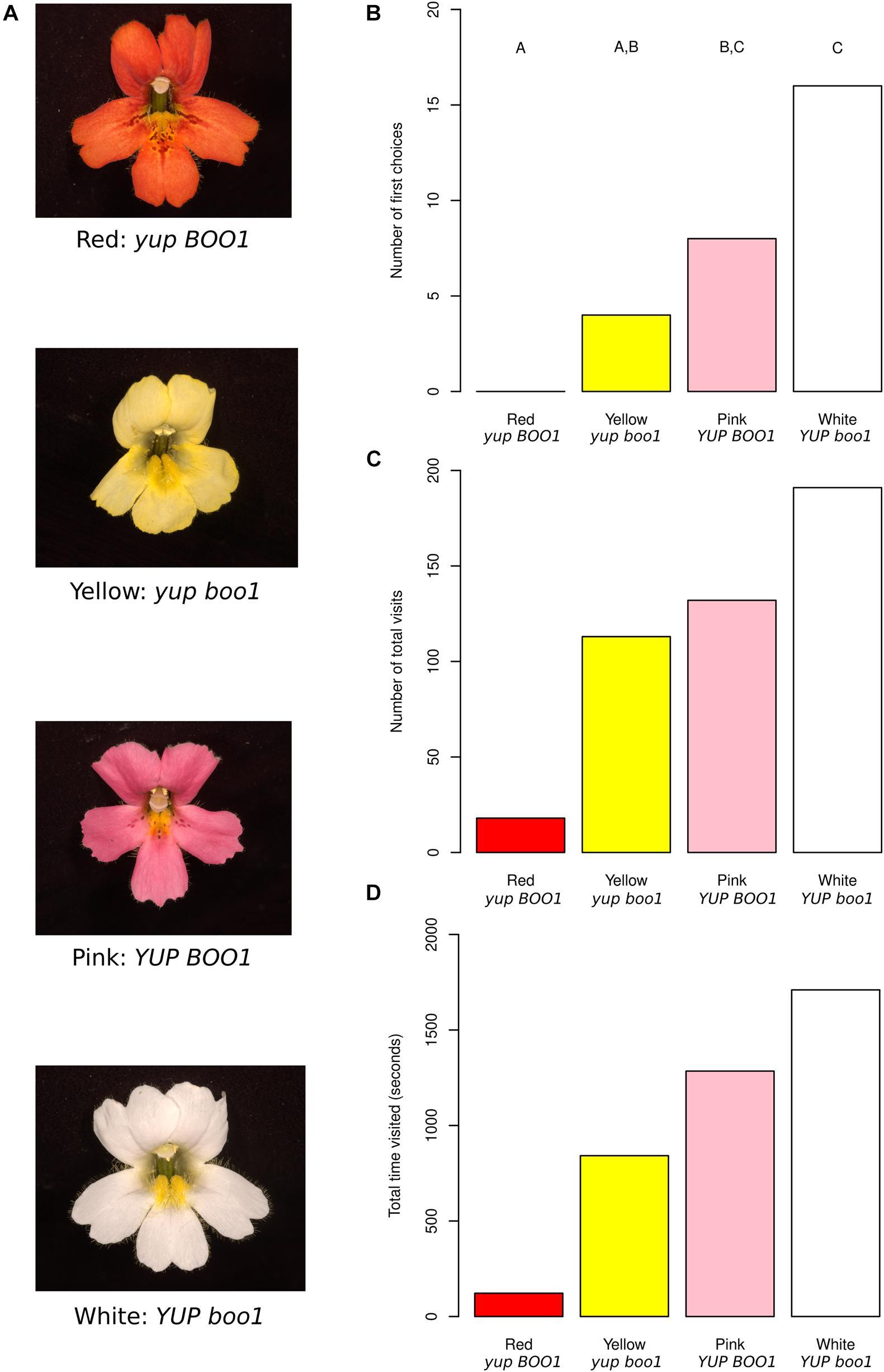研究人员用实验室饲养的天蛾,在之前没有接触过花的情况下,测试了由此产生的四种颜色表型--红色、黄色、粉色和白色--的吸引力。与蜂鸟喜欢的祖先红色相比,天蛾强烈偏爱 "衍生 "的非红色--黄色、粉色和白色,并在实验期间更频繁地光顾这些淡色的花朵,总时间也更长。研究发现,只需要研究人员设计的这两个简单的基因变化,就能影响天蛾传粉者的偏好。