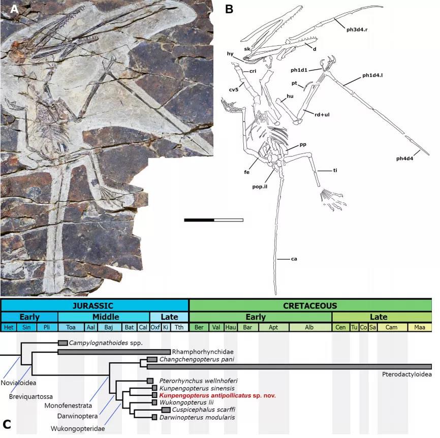 (化石网整理)据科学网(小柯生命):近日,由中国、巴西、英国、丹麦和日本五国科研人员组成的团队共同描述了一件在我国辽西侏罗纪髫髻山组地层中的达尔文翼龙类新种标本——对握鲲鹏翼龙(Kunpengopterus antipollicatus)。它是一种体型较小的达尔文翼龙类翼龙,根据化石保存可推测其翼展约为85厘米。