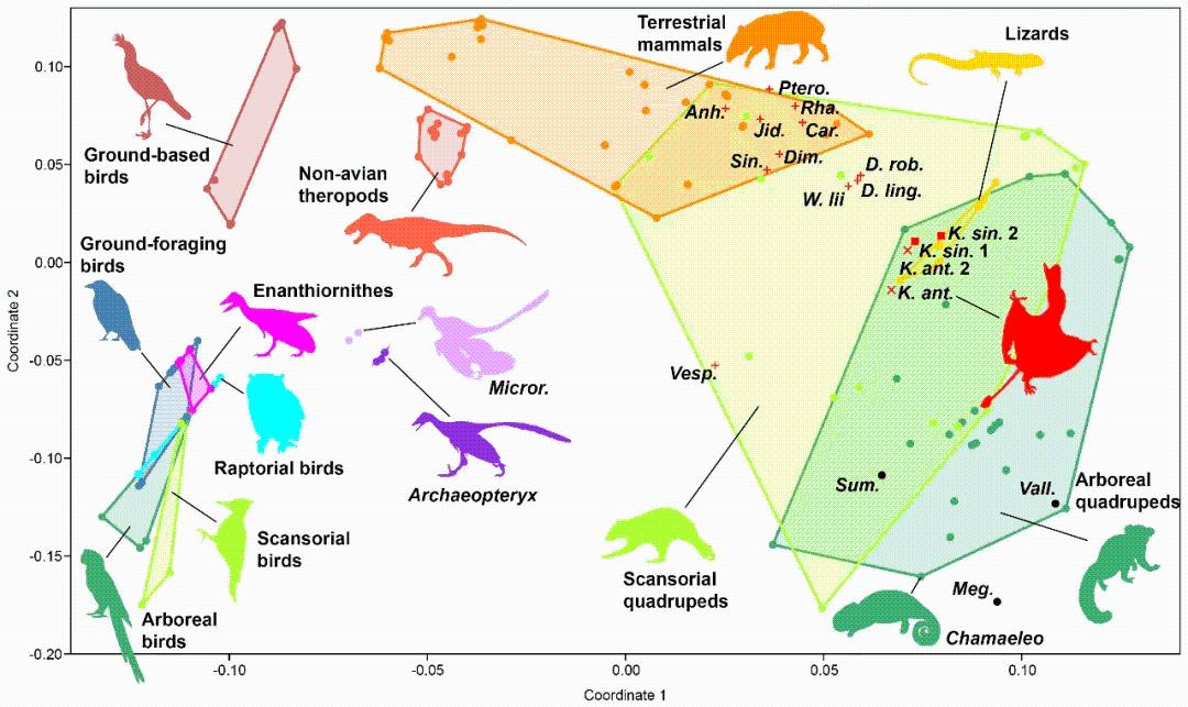 为了验证这一猜想,科研团队通过使用一系列与树栖有关的形态学特征,对对握鲲鹏翼龙和其他翼龙进行了测试分析。分析结果显示,对握鲲鹏翼龙确实属于树栖类型,但同时代,同生态系统内的其他翼龙可能并不属于树栖类型。与此同时,分析结果证实了这些翼龙之间存在不同的生态位分布,并首次通过定量数据分析证实了一部分达尔文翼龙类翼龙属于树栖类型。