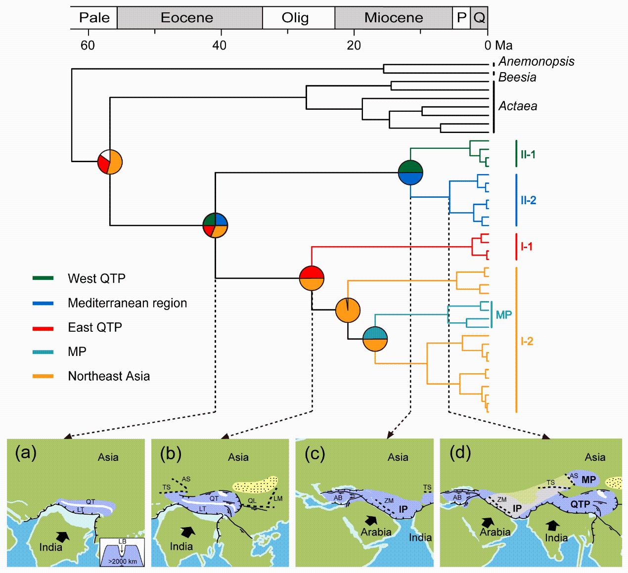 中科院植物所王伟研究组以毛茛科中散播能力较弱的菟葵属为模式类群研究了亚洲三大高原的隆升历史。通过整合系统发育、分化时间和生物地理分析,研究人员认为菟葵属的地理分布格局与青藏高原、伊朗高原和蒙古高原在不同历史时期的隆升密切相关。由此,提出青藏高原至少发生了两次隆升,分别在晚始新世和渐新世-中新世交界期,而伊朗高原和蒙古高原也至少发生了两次隆升,分别在中新世中期和中新世晚期。同时,研究还揭示了土耳其地块(亦称安卡拉地块)向西侧移和伊朗高原在中新世中期的一次隆升同时发生(~12 Ma),这是首次利用系统发育和生物地理学的方法研究土耳其地块的侧移历史。研究人员进一步对所有菟葵属物种的标本数据进行统计,依据经纬度提取海拔信息,发现海拔变化对菟葵属的分化起到重要作用。海拔分布进化重建显示菟葵属最近共同祖先分布的最高海拔仅约1800 m,结合生物地理分析,支持“青藏高原中部存在一东西走向的峡谷”的假说,并进一步提出该峡谷在约40 Ma,海拔高度不足2300 m。