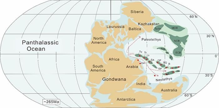另外,科研人员对Shanita-Hemigordiopsis生物组合在全球的分布进行了详细地分析研究,证实了该组合只分布于基墨里陆块和部分冈瓦纳大陆北缘。这种特殊的古地理分布很难单纯地用古生物地理的纬向差异来解释。通过结合Shanita的演化、生长环境及其他方面的证据,研究提出了控制Shanita-Hemigordiopsis组合分布的主要因素是洋流,沿新特提斯洋的洋流对Shanita-Hemigordiopsis的扩散起到了关键性作用。该模式也进一步证明了新特提斯洋在中二叠时期就已经打开。