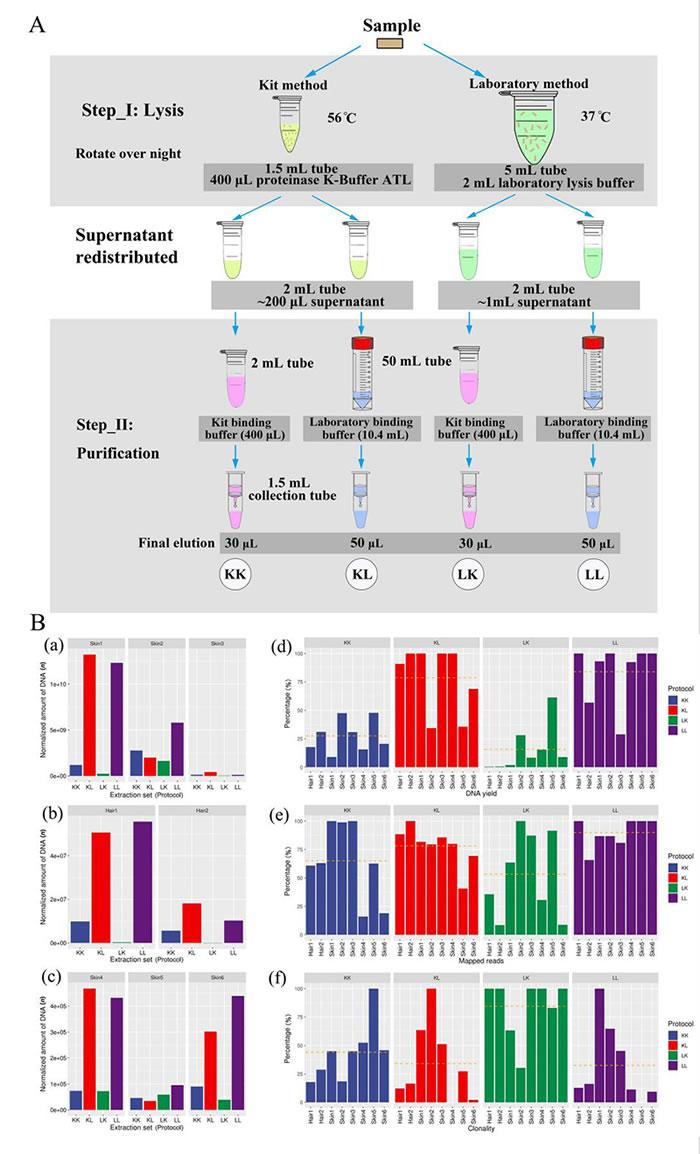 本次研究比较4种提取方法对陈旧皮张DNA提取的有效性,研究比较了所有方法获得的DNA产量和内源短序列数、短序列复杂度、短序列末端损伤、短序列平均长度。结果发现,虽然4种方法均能够有效获取内源DNA片段,但相比于其他方法,改良的古DNA实验室方法能够获得更多和更好质量的DNA信息。改良的古DNA实验室方法在获取陈旧皮张DNA方面有一定优势。同时,该研究还发现,影响提取效果的原因主要是第二步纯化。