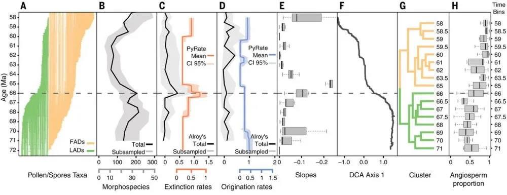 图1南美洲北部马斯特里赫特阶-古新世界限植物多样性和植物组成的变化(Carvalho et al., 2021)。(A)马斯特里赫特阶-古新世界限植物变化(绿色:灭绝植物;桔黄色:新生植物);(B)植物多样性变化;(C)植物灭绝速率;(D)植物产生速率;(E)存活率;(F)植物组成数量;(G)植物组成类型(绿色:马斯特里赫特阶;桔黄色:古新世);(H)被子植物含量