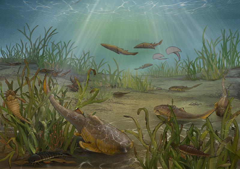 研究团队介绍,4.23亿年前的志留纪晚期,华南古陆漂泊在赤道附近的大洋之中,海水沿着曲折凹凸的海岸线侵入陆架,形成若干巨大的海湾或内海,这些浅海成为早期水中生命的“庇护所”。湘渝之交的重庆秀山地区那时位于华南古陆北缘一个比今日渤海还要大的内海中,河流在这里汇入内海,带来大量养分,并孕育丰富的生命,河口和滩涂的半咸水中生长大量的原始植物,其间生活着无颌的盔甲鱼类、海蝎和最早的有颌鱼类。它们的遗骸被河流带来不断的泥沙覆盖,并在漫长的地质时间内变成化石。