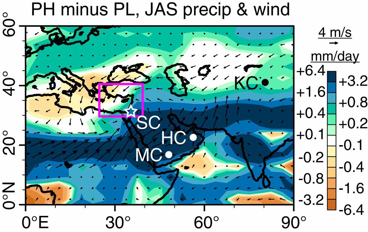 实际上,自从有历史记录以来,黎凡特地区(包括以色列、叙利亚、黎巴嫩、约旦和巴勒斯坦)的冬天一直潮湿,夏天又热又干。在现代之前,那些炎热干燥的夏天会成为人们试图穿越这片土地的一大障碍。之前有研究借助洞穴结构和洞穴矿物发现,在12.5万年前和10.5万年前的两个时期,中东可能比往常更温暖、更潮湿。相关论文2019年刊登于美国《国家科学院院刊》。