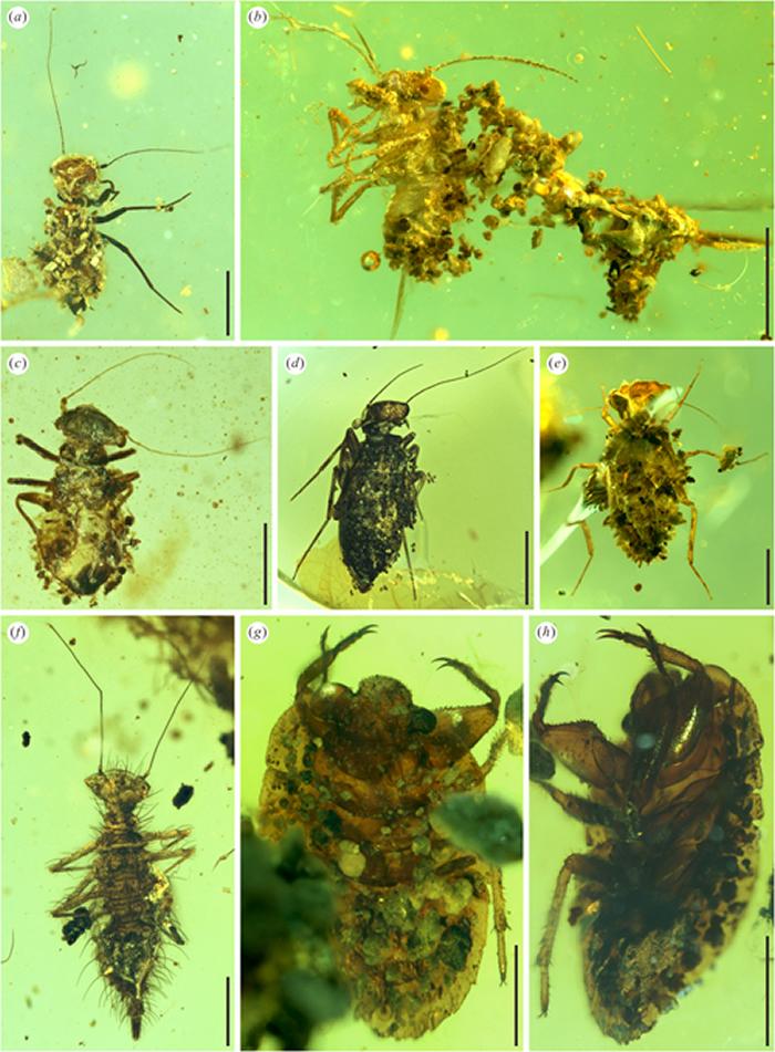 此次研究现了七枚覆物伪装昆虫,涉及两大类昆虫(啮虫目和半翅目蟾蝽科)。其中六枚啮虫目昆虫包括三个形态种类,一枚蟾蝽科昆虫包含一个形态种类。该蟾蝽科昆虫的背上覆盖有大量的碎屑物,包括土壤颗粒、砂砾和植物碎屑等。这类昆虫极有可能利用背部的刚毛将碎屑物质粘在其背上。研究还发现在有花植物植物大辐射之前,大部分具有覆物行为的昆虫,都已经演化出了覆物伪装这一复杂行为。