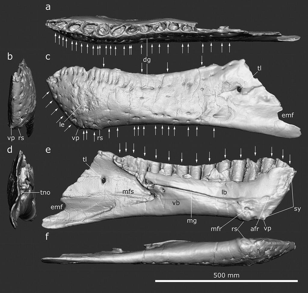 下巴的尖端可能足够敏感,例如,可以在进食时分辨骨头和肉之间的区别。尽管有足够坚固的牙齿可以压碎骨头,但过去的研究发现证据表明,这些恐龙具有足够的洞察力,可以在不压碎骨头的情况下小心地啃掉骨头上的肉。