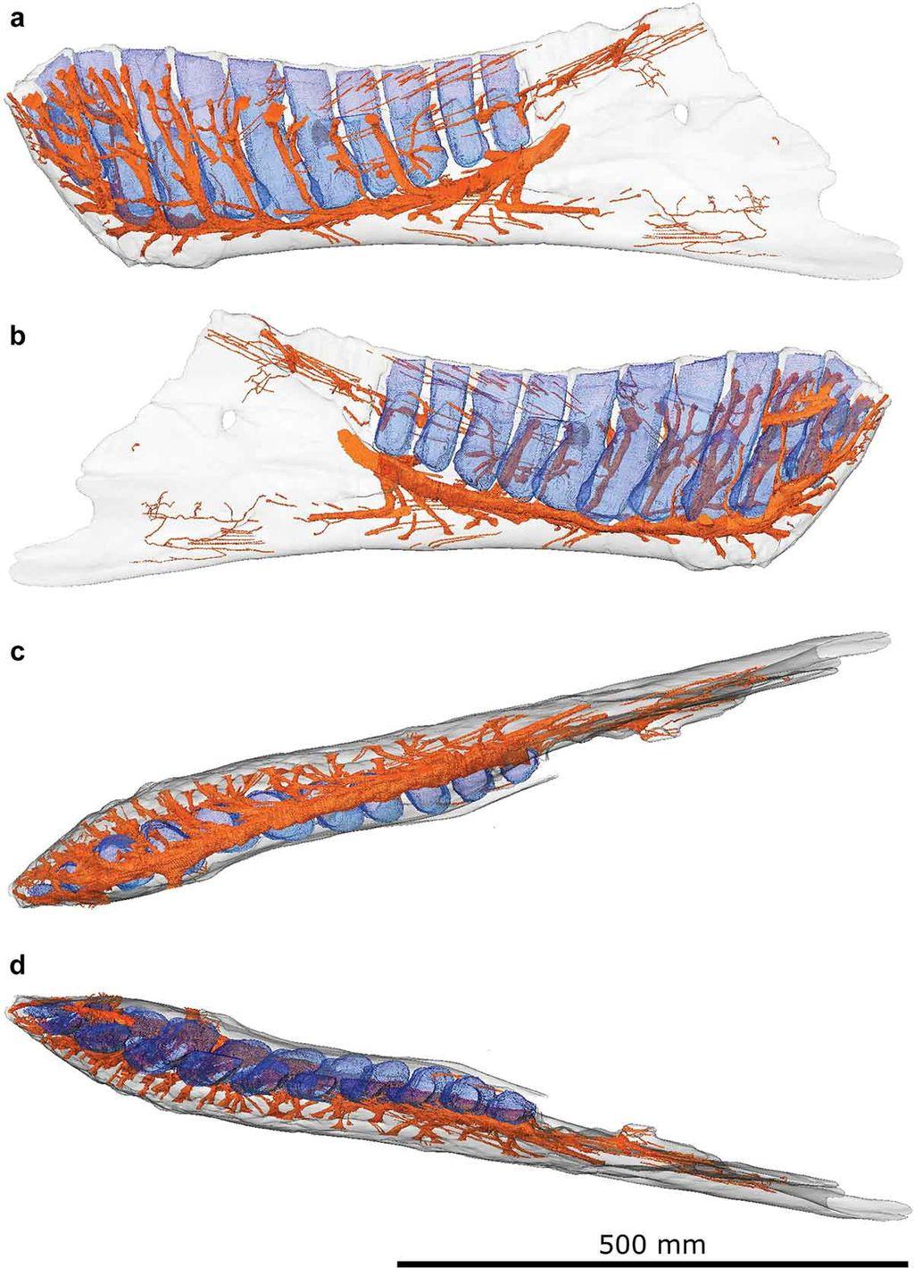 近日发表在《Historical Biology》上的一项新研究揭示了霸王龙拥有一个“复杂的神经血管系统”,包括牙齿在内,可以让它们的下巴尖端成为“敏感的触觉传感器”。这种复杂的特征可能使霸王龙在同类中具有独特的能力,可以从食物中辨别出不同的元素。