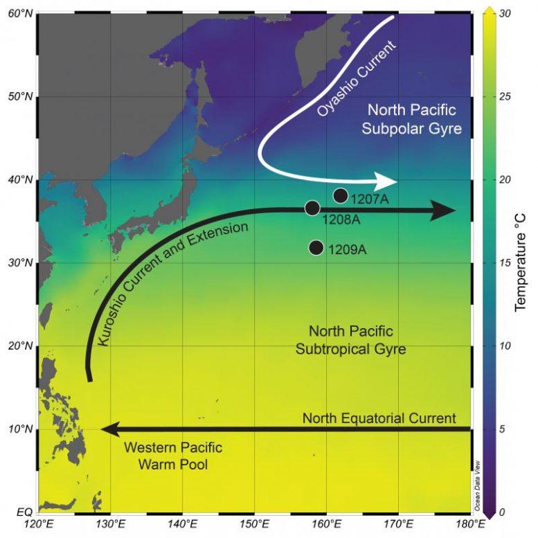 在这项研究中,研究人员使用了从生活在表层海洋的浮游生物化石中获得的化学信号,以及从Shatsky海隆(西北太平洋海底的一个位置)获得的三个深海沉积物核心。在过去的1.7亿年里,浮游有孔虫一直生活在开放的海洋中;它们耐用的外壳,被称为"测试",是由碳酸钙制成的,当它们死亡时,会积聚在洋底。