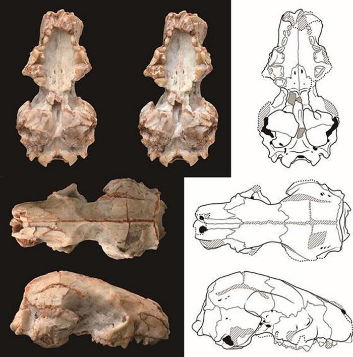 准噶尔合短面猬头骨照片和线条图(高伟摄、李录绘,中科院古脊椎所供图)