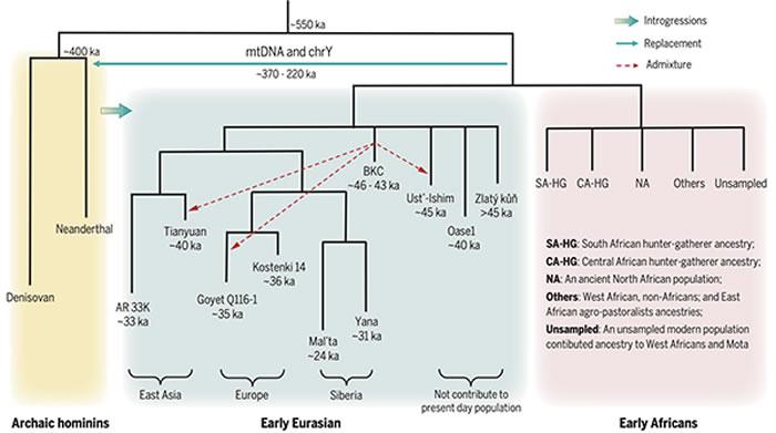 图二. 古老型人类和早期现代人的遗传历史示意图