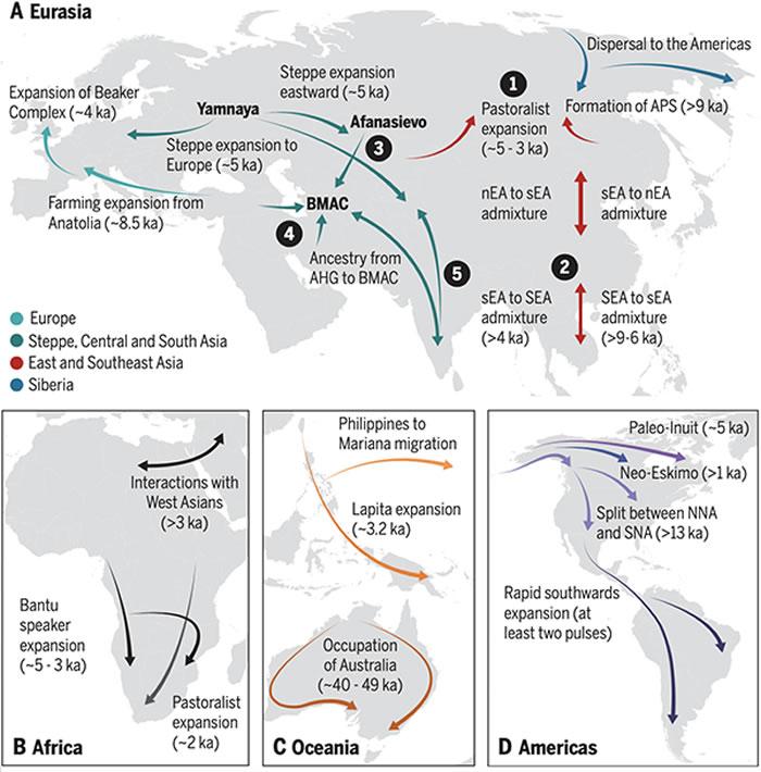 近万年来,气候变得温暖而稳定。全球出现了更为活跃的人群活动,包括快速的扩散、迁徙、互动和更替等。全球不同地区的人群呈现出不同的规律,有些地区以内部人群互动为主,呈现出长时间的人群连续性,比如东亚和澳大利亚;有些地区则出现了多次的人群混合和取代,比如欧洲和欧亚草原地区。这些世界范围的人群迁徙与互动,以及后续相关历史事件的影响,逐步形成了全球人群的大致格局。