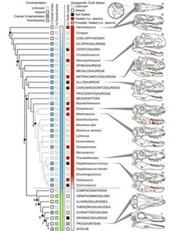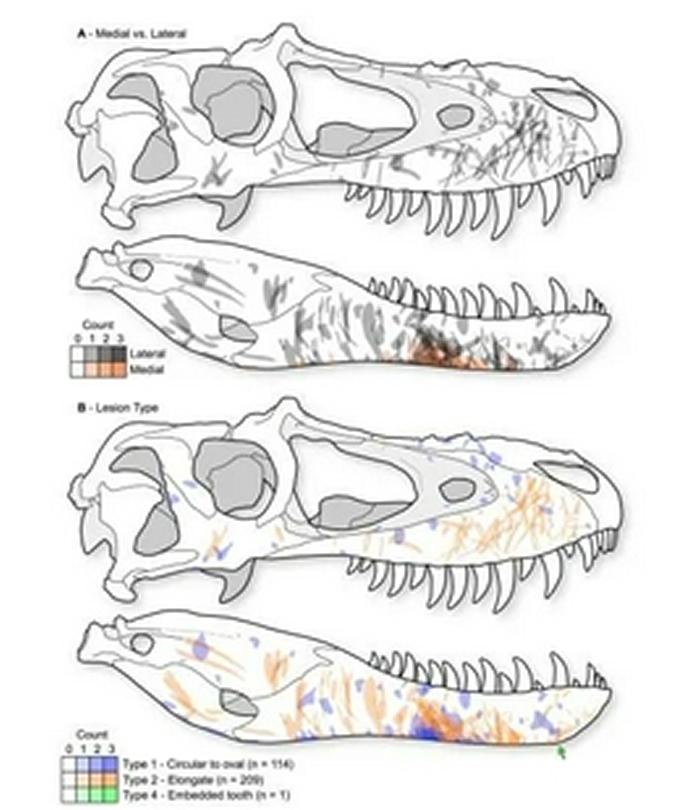 另一方面,研究人员还发现,虽然面部疤痕十分常见,但幼年霸王龙化石上却找不到这样的咬痕。据研究数据统计,大约50%的大型霸王龙(但尚未完全性成熟)的头骨存在咬痕;大约60%的成年霸王龙的头骨存在咬痕。