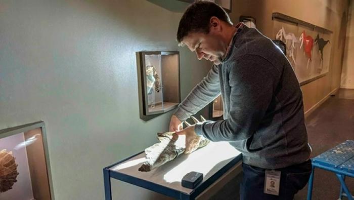 Caleb Brown正在检查艾伯塔龙的颚骨化石。(图片来源:皇家泰瑞尔古生物学博物馆)
