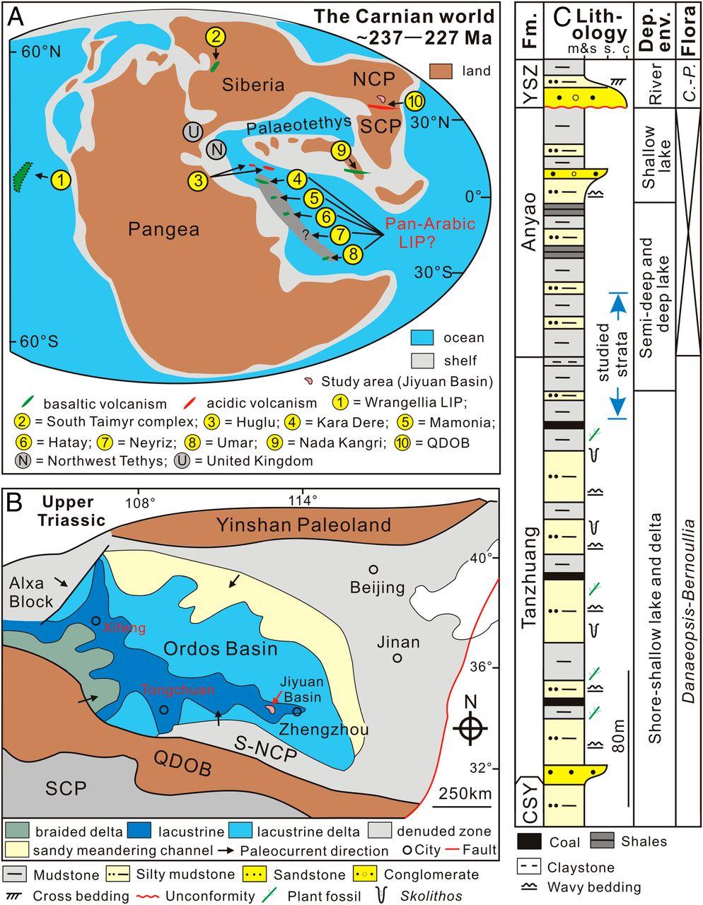 研究人员分析了中国北方济源盆地的一个湖泊的沉积物和植物化石记录,将火山活动的频率与重大环境变化相匹配,包括大约2.34亿至2.32亿年前CPE的"超级季风"气候。